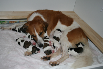 - Unsere Hündin gehört zur Familie und auch die Welpen wachsen im Kreis der Familie auf. Die Wurfkiste ist idR die Geburtsstätte der Welpen und vor allem für die ersten Wochen ihr Zuhause. Sie steht bei uns im Wohnbereich, also in einer für unsere Hündin gewohnten Umgebung. Damit bleibt unsere Hündin als Teil unserer Familie während der Geburt und der Aufzucht mitten unter uns. Natürlich kann sie sich aber auch in ihre Wurfkiste zurückziehen und sich ungestört ihren Welpen widmen.